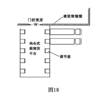 當建筑物墻壁空間不足以設置平臺位置或建筑物及周圍通道布局使平臺不能沿墻壁周圍設置時,則可設計碼頭式平臺解決這一問題,此設計為確保叉車進出順暢,門凈寬度應在6米以上。(圖1 8 )