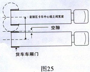 常用貨車寬度是2.2-2.5米,貨車垂直停靠在平臺前所需泊車位最小3.5米寬,為防止平臺內外交通阻塞,4米寬或以上的泊車位是較佳的設計。如車廂門向兩側打開的貨車停靠在平臺后才開門時,泊車位至少要4米寬(圖25),否則,車廂門會互相觸碰或不能完全打開。現在歐美流行的向車廂頂部提升的卷廉門則所需泊車位寬度可適當窄些。