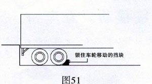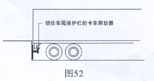 卡車限動器有兩種設計:鎖住車輪的卡車限動器(圖51)和鎖住貨車尾部保護杠的卡車限動器(圖52) 。其中直接作用于車輪,不依賴貨車其它部位,因此使用面較廣,但土建安裝較麻煩。在目前中國最簡單省錢的做法是在車輪前墊一塊木制、膠制或鋼制的三角塊阻止車輪移動,但對人為開動貨車而造成的意外作用不大。