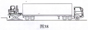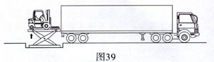 貨車底板高度超出調(diào)節(jié)板調(diào)節(jié)范圍時(shí),選用液壓升降平臺(tái)可有效解決叉車進(jìn)出貨車的問題。升降平臺(tái)還可將叉車從裝卸臺(tái)平面降至地面。升降平臺(tái)采用剪叉式設(shè)計(jì),兩端設(shè)置有搭板,可使叉車順利通過(圖38)。使用升降平臺(tái)還可從地面裝卸貨(圖39)。