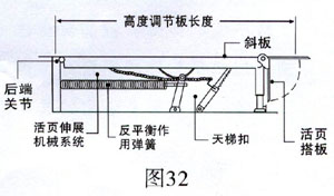 ● 低壓空氣動力系統設計簡單(圖31)它利用一個與強力鼓風機連接在一起的氣袋提升起斜板,斜板靠自身重量在下降時利用推桿推出搭板,搭在貨車車廂底板上。這種設計新穎,適合不同溫度地區。(氣袋作用只是提升斜板;不起任何承重作用)。