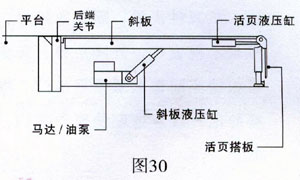 ● 液壓式調節板(圖30)由液壓系統產生動力,提升起斜板。液壓式調節板噪音少、運行平穩、使用可靠,在歐、日、亞使用普遍,頗受歡迎。